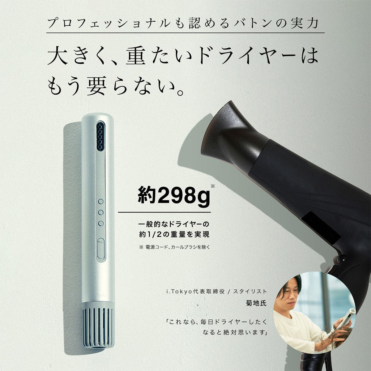 通常のノーズがついたドライヤーでこの最適なドライを行うとかなり腕に負担がかかる一方で、スティック形状のbaton(バトン)はラクにドライ可能です。